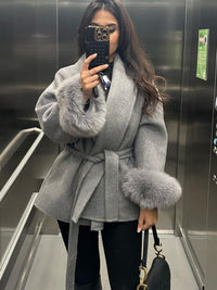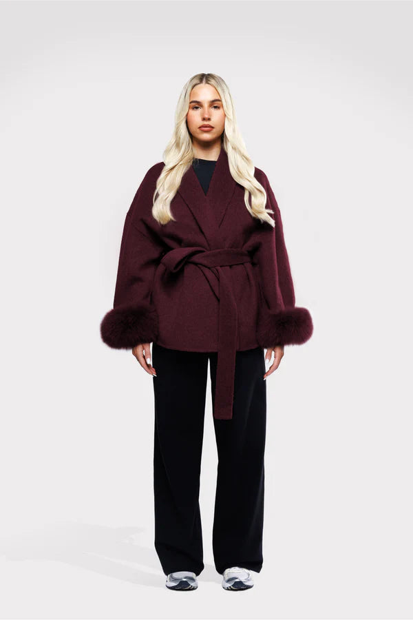 Chaque détail compte : la tenue du manteau, la texture de sa laine, la silhouette sculptée par la ceinture et la finesse de la fourrure aux manches.