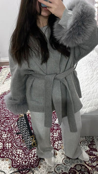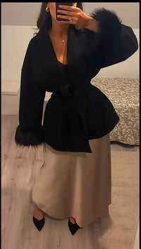 Les manches ornées de fourrure ajoutent une touche raffinée, tout en conservant un style sobre et moderne.